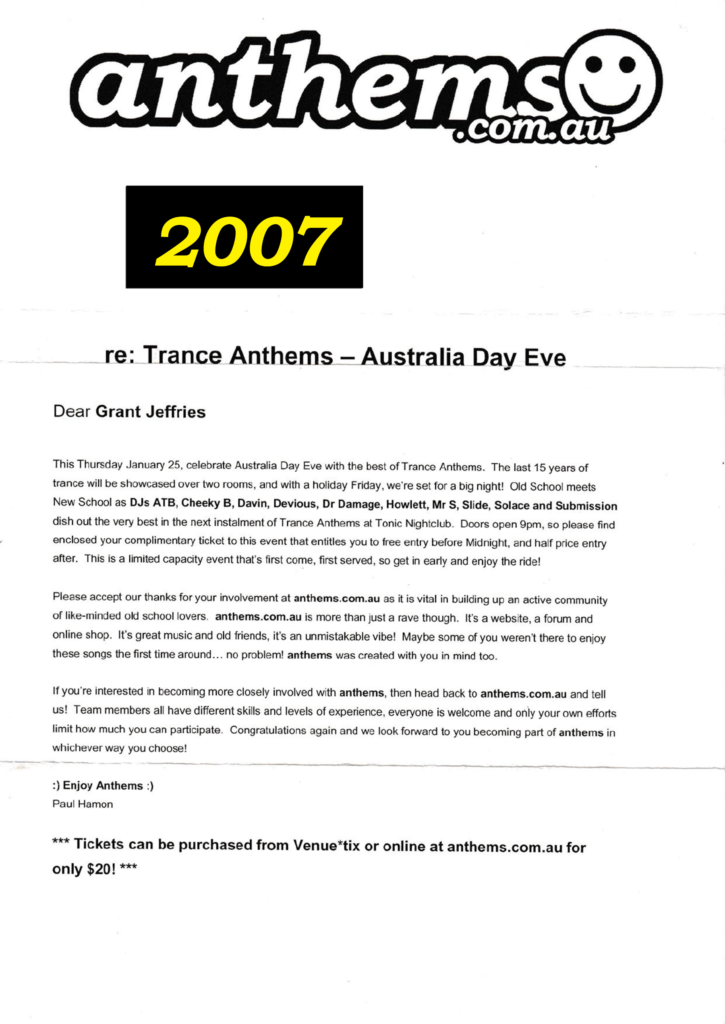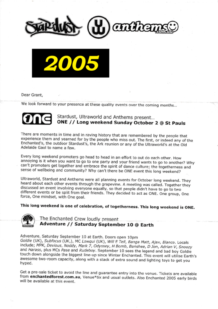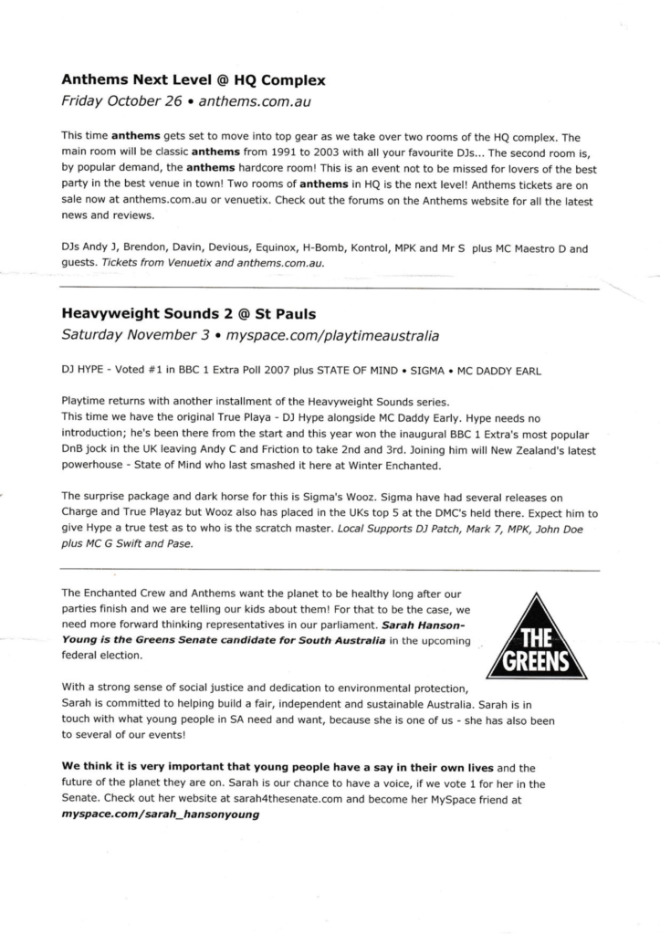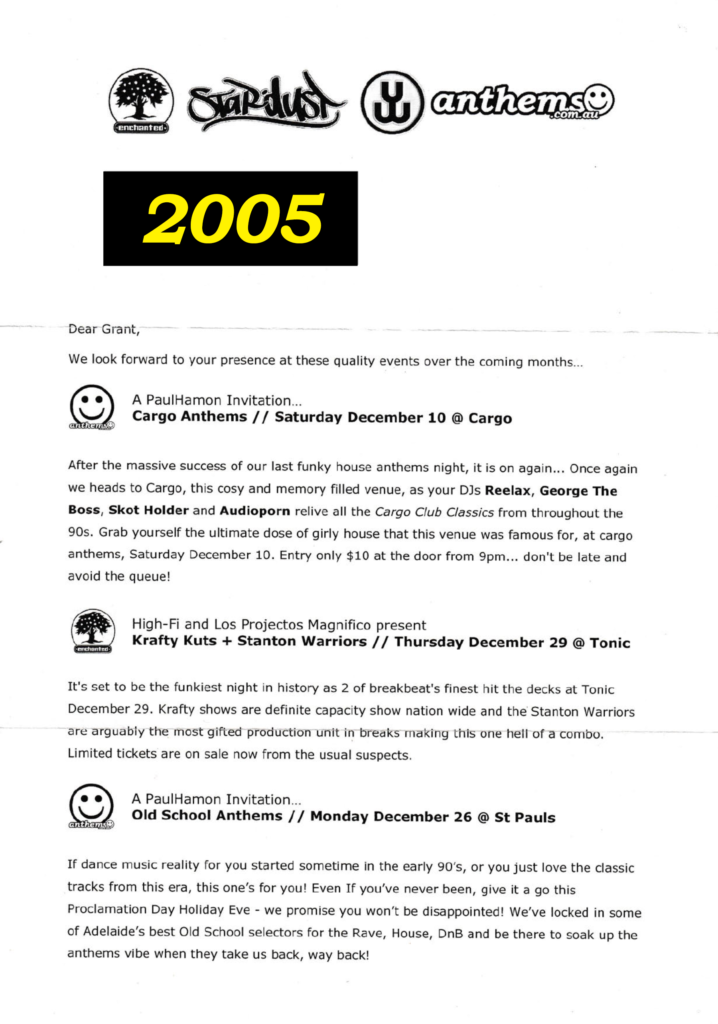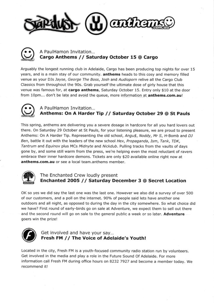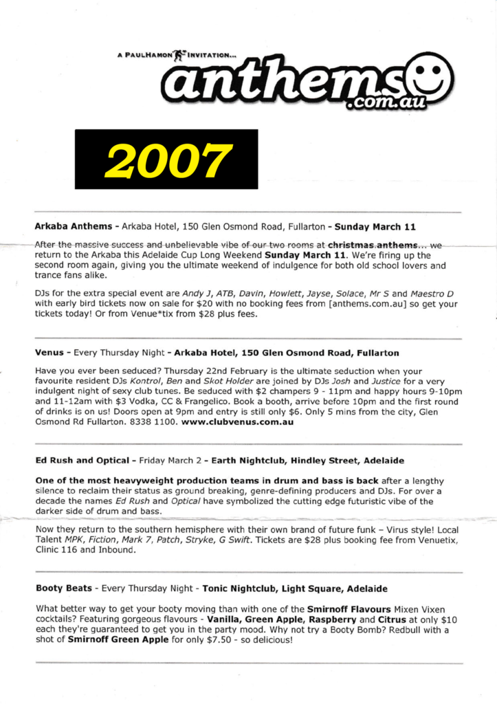 This document chronicles a series of electronic music events that shaped Adelaide’s vibrant scene between 2005 and 2007. This dynamic period was driven by the vision and dedication of promoters like Anthems, Stardust, and The Enchanted Crew, who consistently brought premier international talent to the city while nurturing a strong local community. The following archive, compiled from original event mailers, provides a detailed look at the parties, venues, and artists that defined an era.