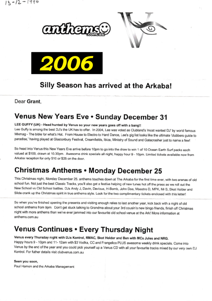 - Weekly Thursdays @ Venus (Arkaba): A consistent weekly event that became a staple for many. The resident DJ lineup included Kontrol, RMAC, Skot Holder, and DJ Ben, with MCs Jules and NRG providing vocal support. Promotions varied but included a “first round of drinks on us” for patrons arriving before 9:30pm, extensive happy hours, and an end-of-year offer of a free CD mixed by DJ Kontrol.